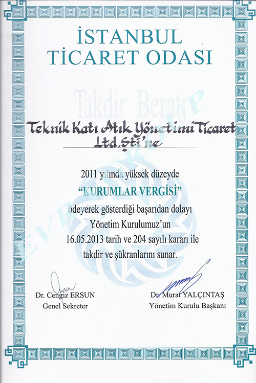 Teknik Katı Atık Yön. Tic.Ltd,Şti 1.932.470,14 TL ile Gümüş Madalya ,