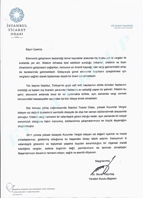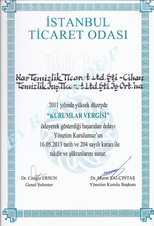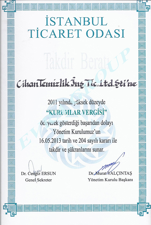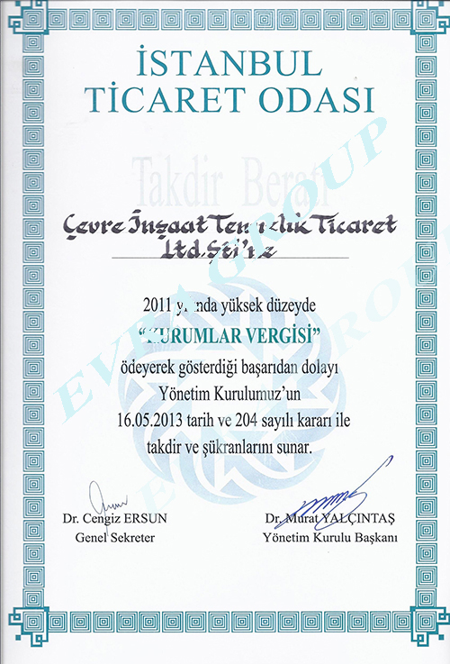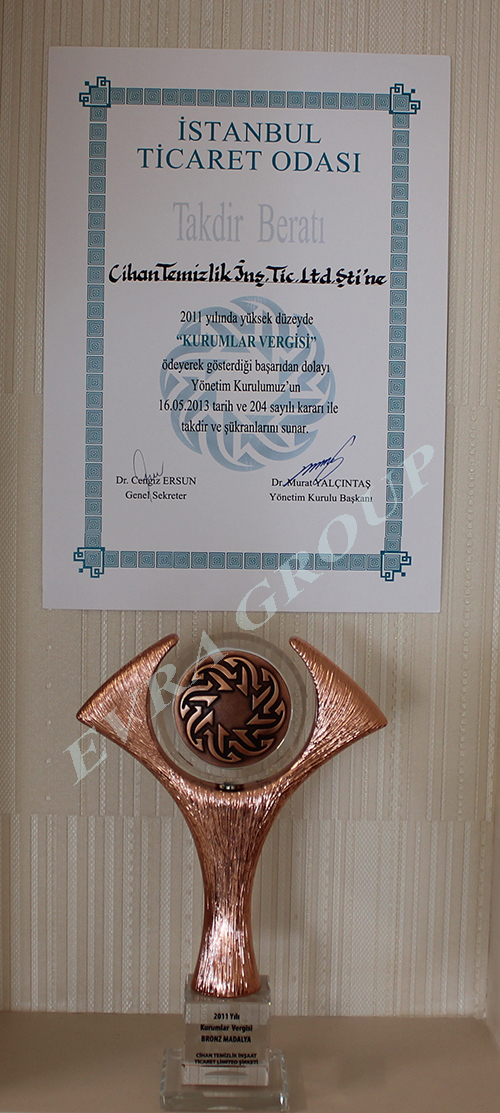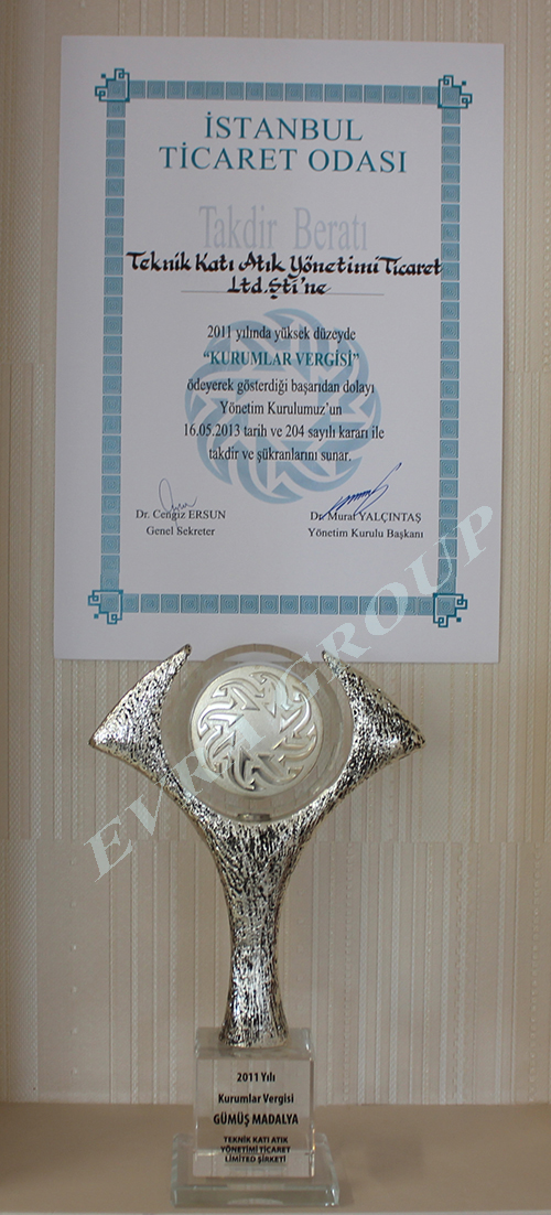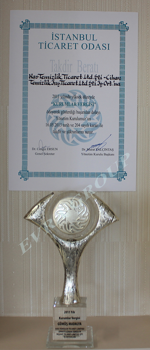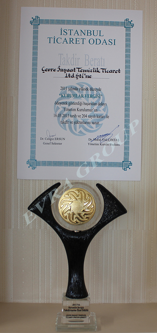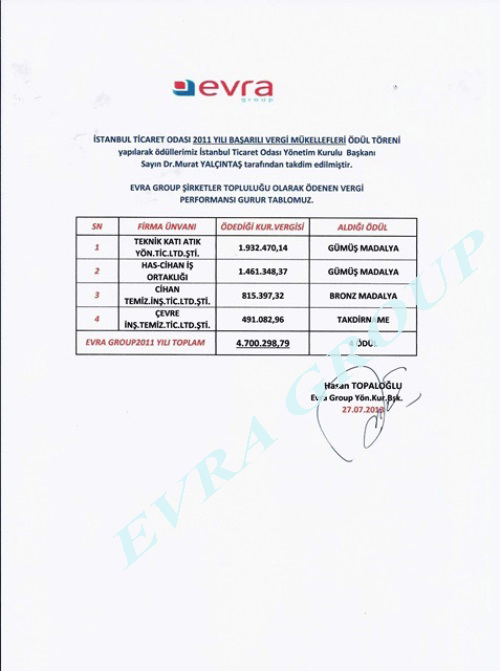 İstanbul Ticaret Odası tarafından 2011 Yılı Başarılı Vergi Mükellefleri Ödül Töreninde Evra Group 4 Ödüle layık görüldü. Ödüller İTO Yönetim Kurulu Başkanı Sayın Dr. Murat YALÇINTAŞ tarafından takdim edildi. 2011 yılında EVRA GROUP toplam 4.700.298,79 TL vergi ödeyerek 4 firması adına ödül aldı.